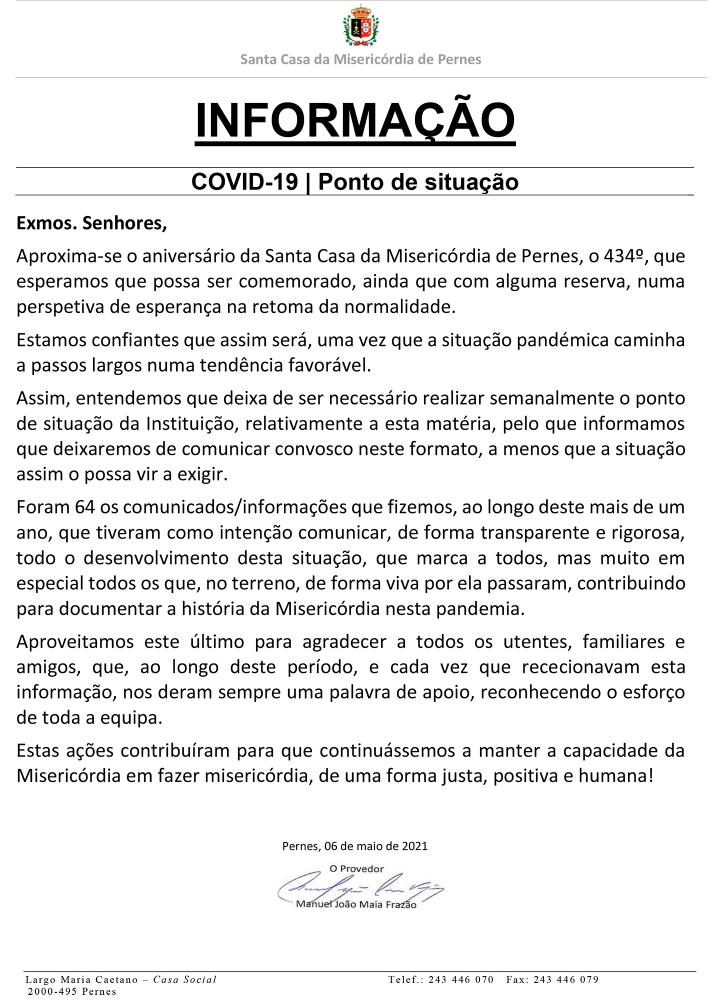 Assim, entendemos que deixa de ser necessário realizar semanalmente o ponto de situação da Instituição, relativamente a esta matéria, pelo que informamos que deixaremos de comunicar convosco neste formato, a menos que a situação assim o possa vir a exigir.