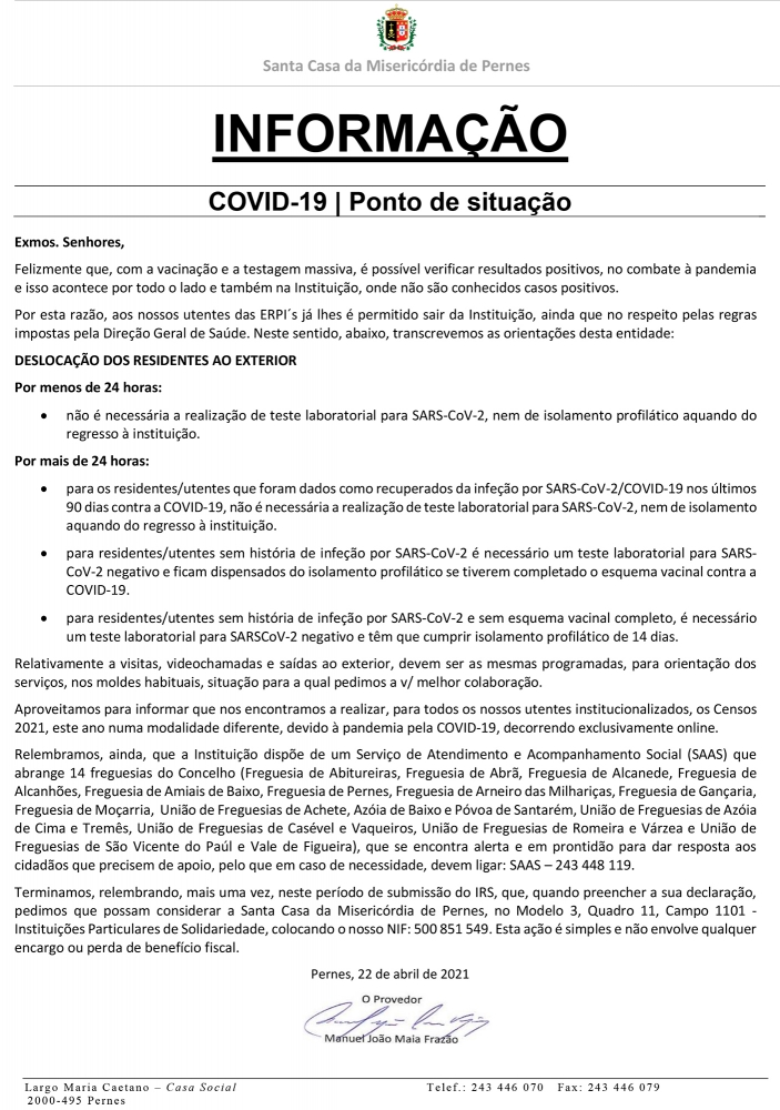 Felizmente que, com a vacinação e a testagem massiva, é possível verificar resultados positivos, no combate à pandemia e isso acontece por todo o lado e também na Instituição, onde não são conhecidos casos positivos.