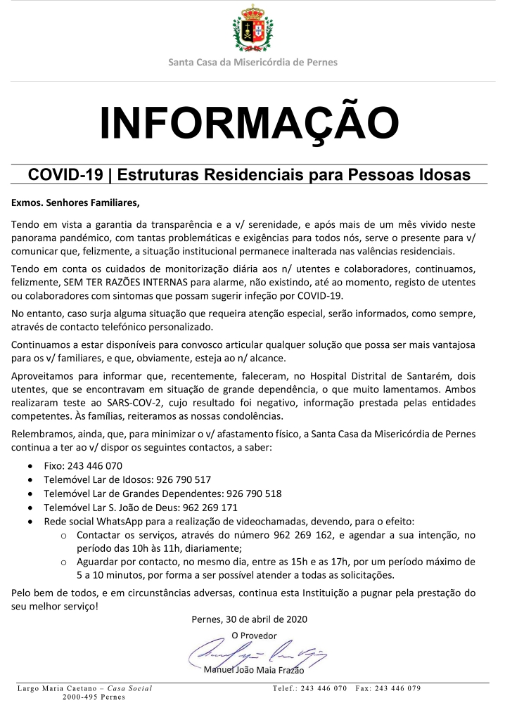 Relembramos, ainda, que, para minimizar o v/ afastamento físico, a Santa Casa da Misericórdia de Pernes continua a ter ao v/ dispor os seguintes contactos, a saber: