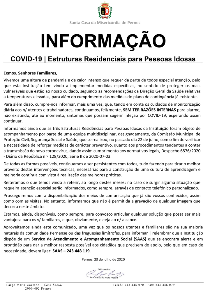 Aproveitamos ainda este comunicado, uma vez que os nossos utentes e familiares são na sua maioria naturais da comunidade Pernense ou das freguesias limítrofes, para informar | relembrar que a Instituição dispõe de um Serviço de Atendimento e Acompanhamento Social (SAAS) que se encontra alerta e em prontidão para dar a melhor resposta possível aos cidadãos que precisem de apoio, pelo que em caso de necessidade, devem ligar: SAAS – 243 448 119.