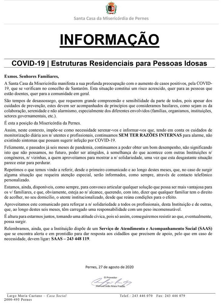 Assim, neste contexto, impõe-se como necessidade serenar-vos e informar-vos que, tendo em conta os cuidados de monitorização diária aos n/ utentes e profissionais, continuamos SEM TER RAZÕES INTERNAS para alarme, não existindo sintomas que possam sugerir infeção por COVID-19.