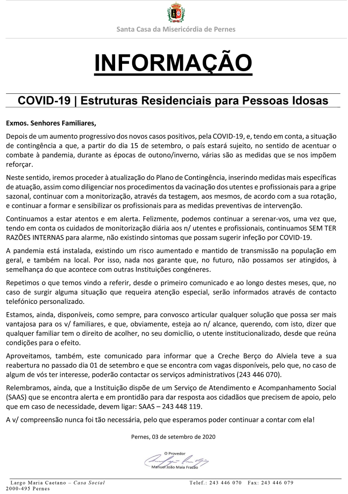 Aproveitamos, também, este comunicado para informar que a Creche Berço do Alviela teve a sua reabertura no passado dia 01 de setembro e que se encontra com vagas disponíveis, pelo que, no caso de algum de vós ter interesse, poderão contactar os serviços administrativos (243 446 070).