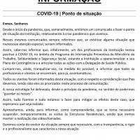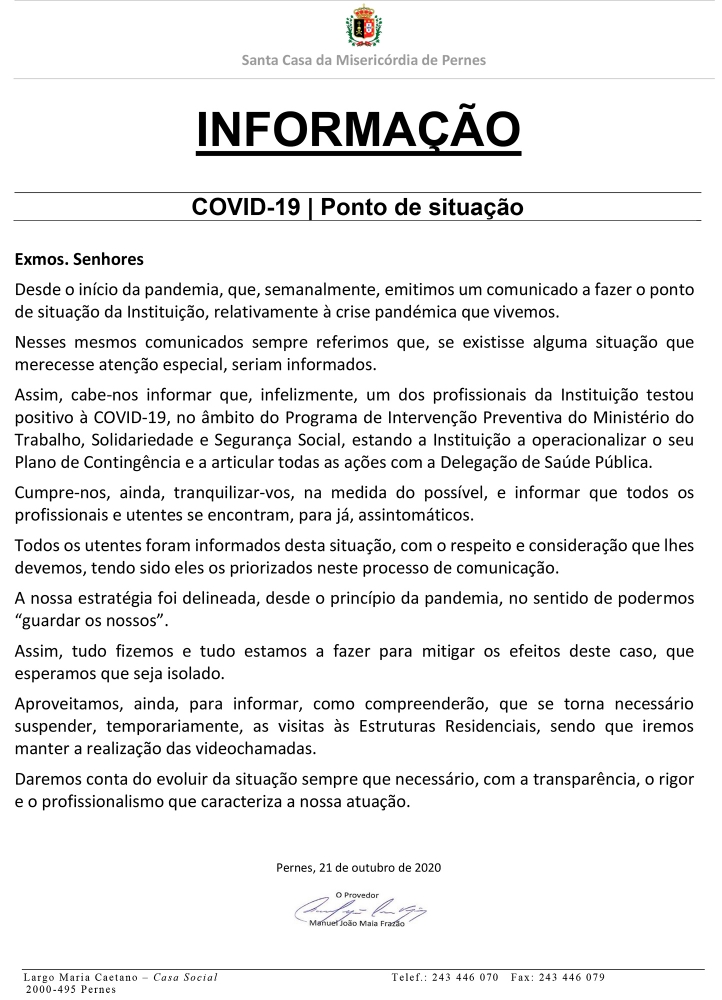 Assim, cabe-nos informar que, infelizmente, um dos profissionais da Instituição testou positivo à COVID-19, no âmbito do Programa de Intervenção Preventiva do Ministério do Trabalho, Solidariedade e Segurança Social, estando a Instituição a operacionalizar o seu Plano de Contingência e a articular todas as ações com a Delegação de Saúde Pública.