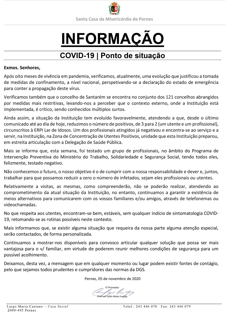 Relativamente a visitas, as mesmas, como compreenderão, não se poderão realizar, atendendo ao comprometimento da atual situação da Instituição, no entanto, continuamos a garantir a existência de meios alternativos para comunicarem com os vossos familiares e/ou amigos, através de telefonemas ou videochamadas.