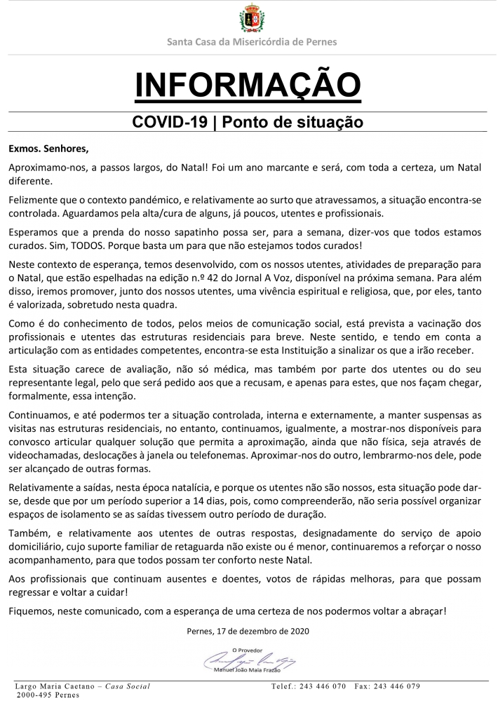 Continuamos, e até podermos ter a situação controlada, interna e externamente, a manter suspensas as visitas nas estruturas residenciais, no entanto, continuamos, igualmente, a mostrar-nos disponíveis para convosco articular qualquer solução que permita a aproximação, ainda que não física, seja através de videochamadas, deslocações à janela ou telefonemas. Aproximar-nos do outro, lembrarmo-nos dele, pode ser alcançado de outras formas.