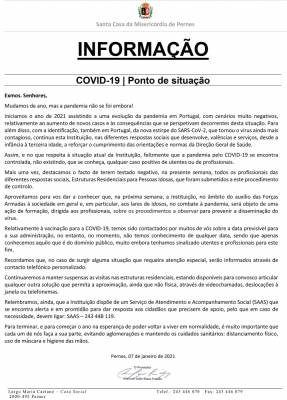 Assim, e no que respeita à situação atual da Instituição, felizmente que a pandemia pelo COVID-19 se encontra controlada, não existindo, que se conheça, qualquer caso positivo de utentes ou de profissionais.