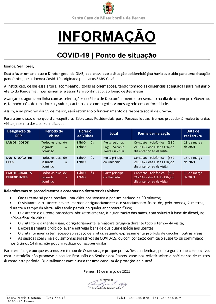 A Instituição, desde essa altura, acompanhou todas as orientações, tendo tomado as diligências adequadas para mitigar o efeito da Pandemia, internamente, e assim tem continuado, ao longo destes meses.